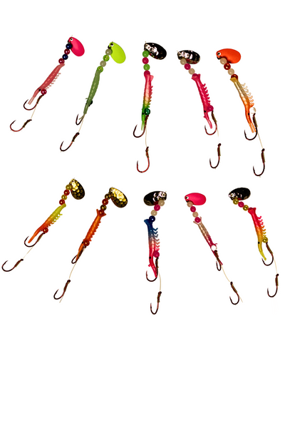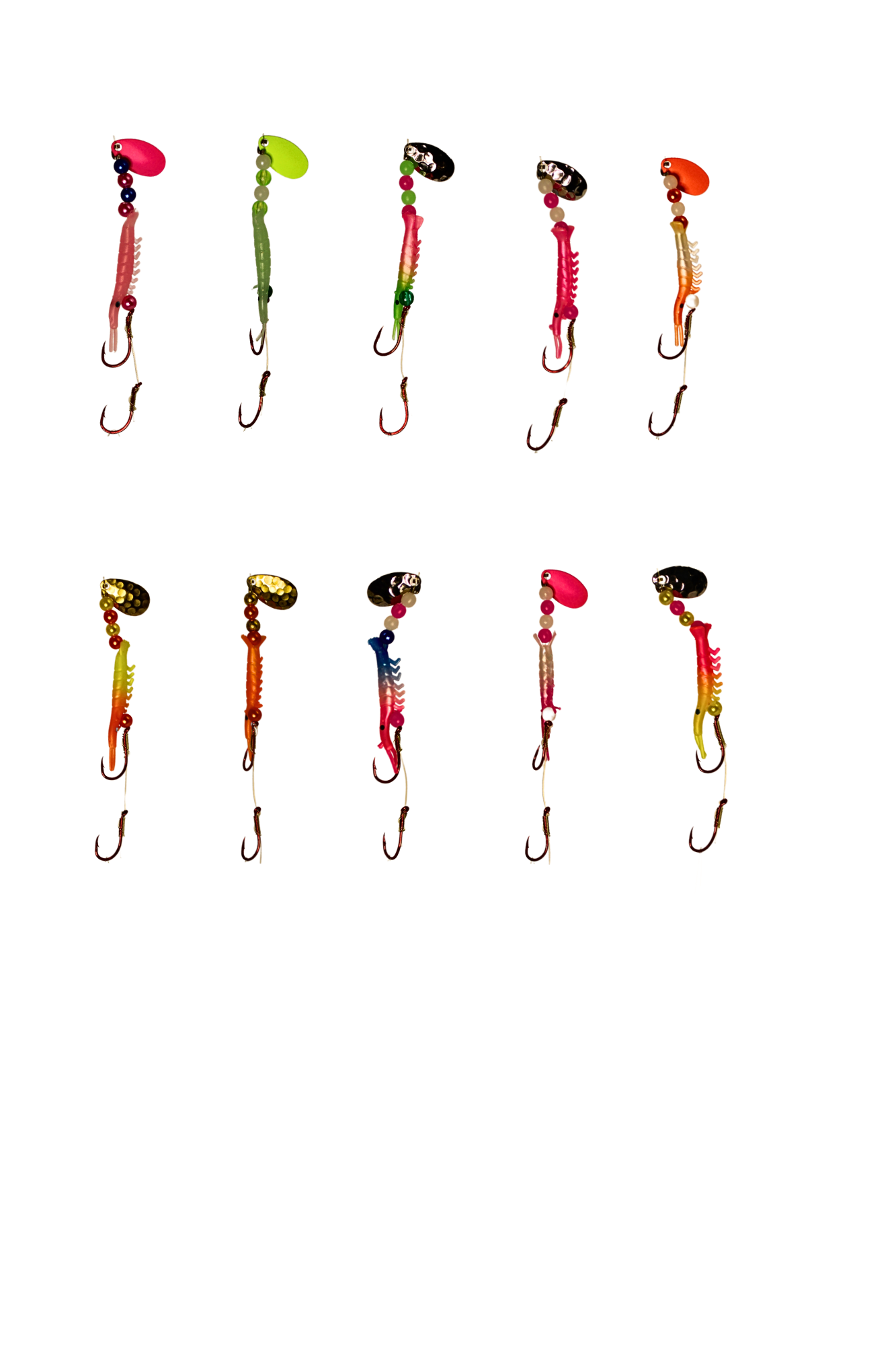 - VIBRANT UV MULTICOLOR DESIGN WITH SPINNER BLADES: Includes multicolor shrimp lures with spinner blades and colored beads to enhance visibility and attract fish, especially kokanee and trout.