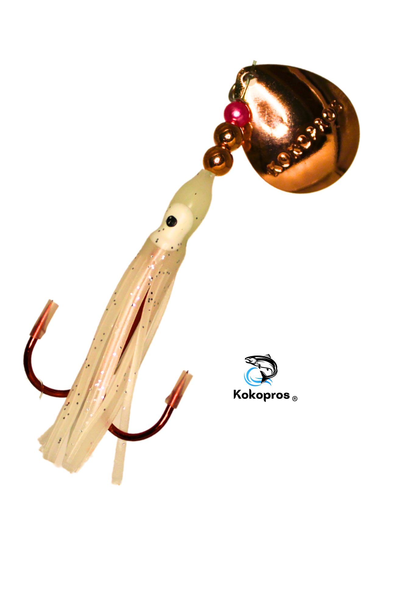 Salmon Tackle - Kokopros® Ghost White #7- 2/0 Treble- Luminous Salmon Hoochie with Kokopros Spinner Blade (TREBLE)